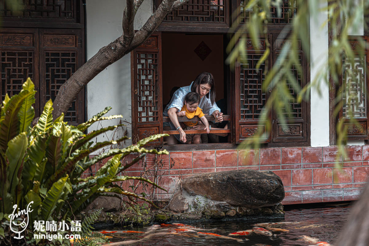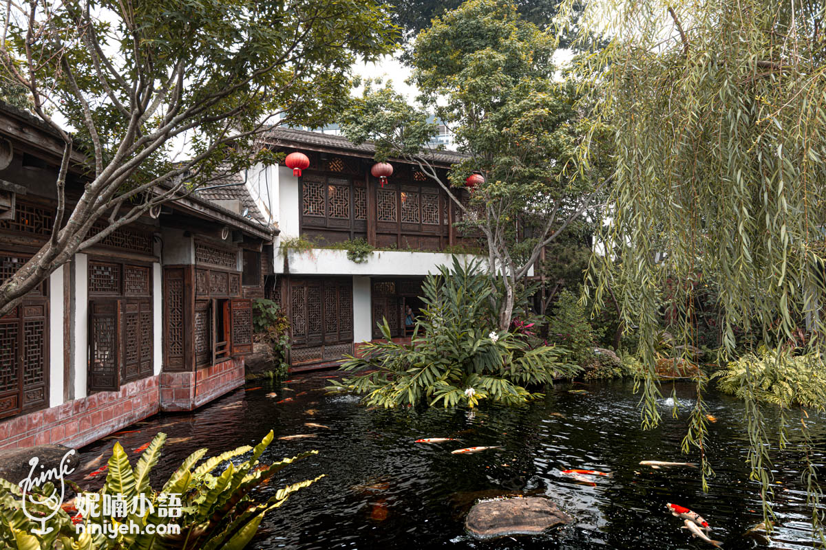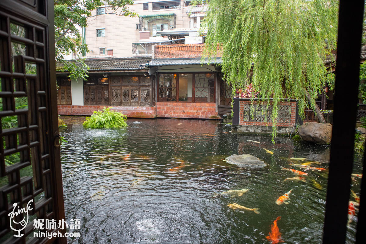 用餐前一個月就已經先預訂好《竹居茶樓》最搶手的半包廂蓆座,大約可容納6-8位,是需要脫鞋盤腿坐的涼蓆座位,很似日式塌塌米,座位邊就是可對開的中式窗櫺,窗外景色便是水塘,好多錦鯉自在悠游,倚坐用餐頗有詩意。