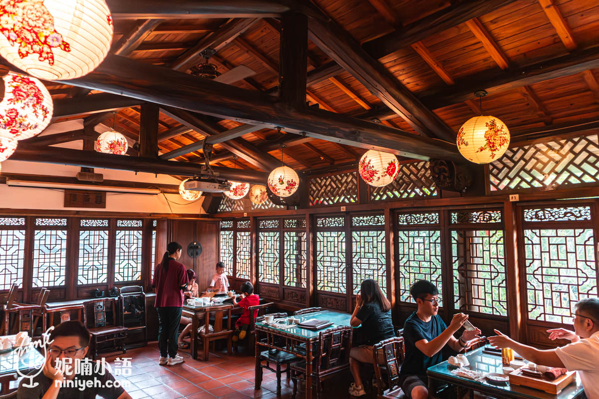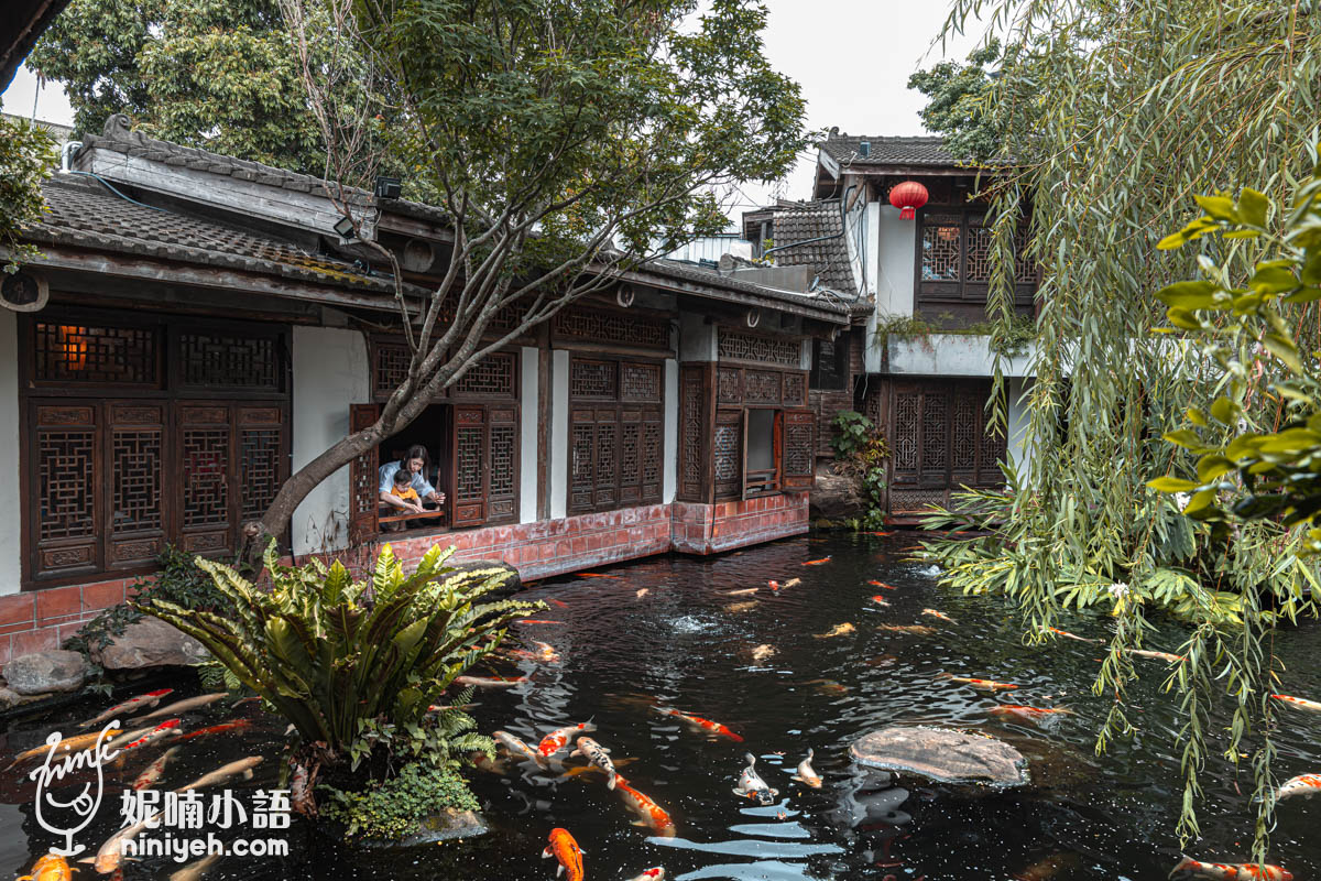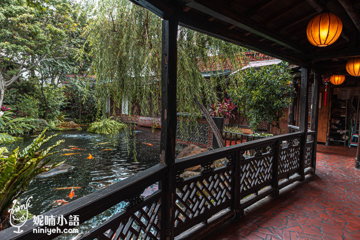 走進『竹居茶樓』不禁讓我想起台中的《無為草堂》、新竹的《The One南園人文客棧》,都有古色古香的迴廊、小橋流水和江南庭園,燈籠高掛、柳枝垂墜還有窗花陪襯下顯得仙氣飄飄,不過 『竹居茶樓』沒有前兩家這麼細心維護,難掩老舊氣息。
