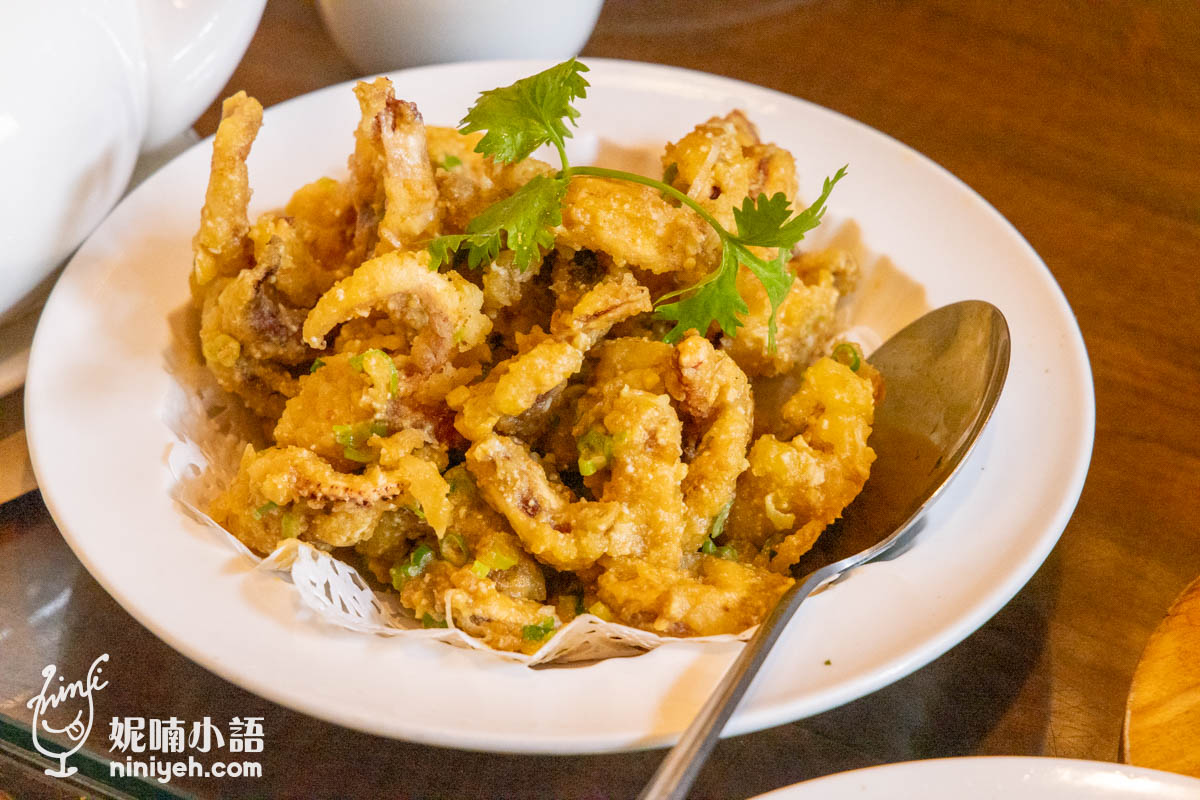 我特愛吃鹹蛋黃系列,這盤熱炒店最愛點的金沙中卷真是涮嘴,裹著薄衣的透抽彈脆脆,鋪上細細密密的鹹蛋黃,油滋鹹香的又不硬老難咬,好吃。