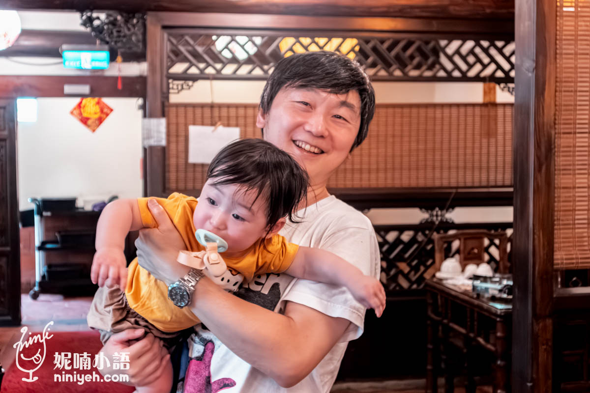 今天安排來到『竹居茶樓』家庭用餐,綿綿陰雨悶熱讓人不耐,入口處雖然有個斜坡讓行動不便者可以不用爬樓梯,但是坡度實在太陡,坐輪椅的長者上去要很小心,還有推嬰兒推車的我們也很不方便,最後是用抱的,而且餐廳內不太有地方擺推車哦。