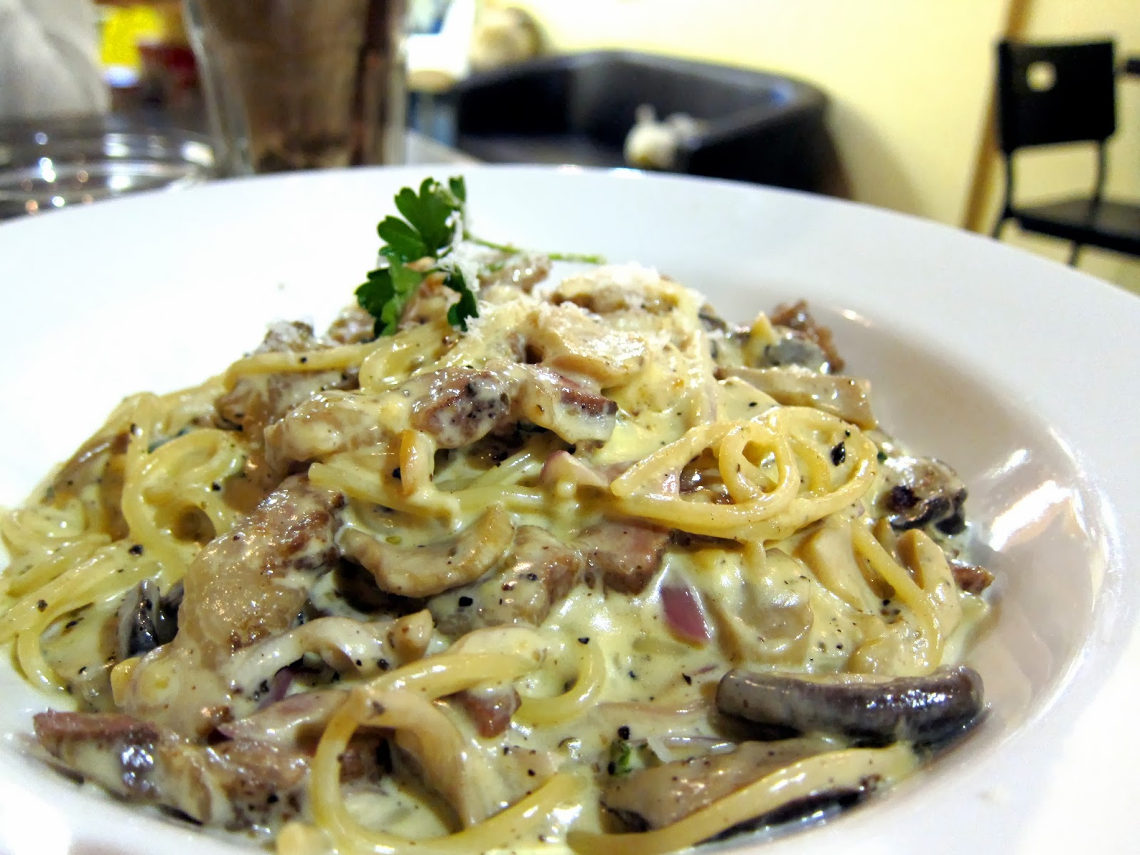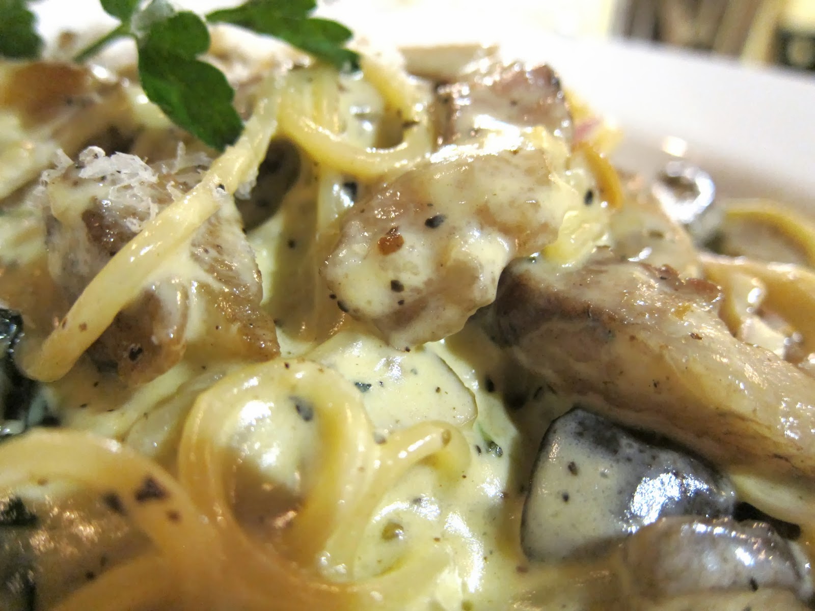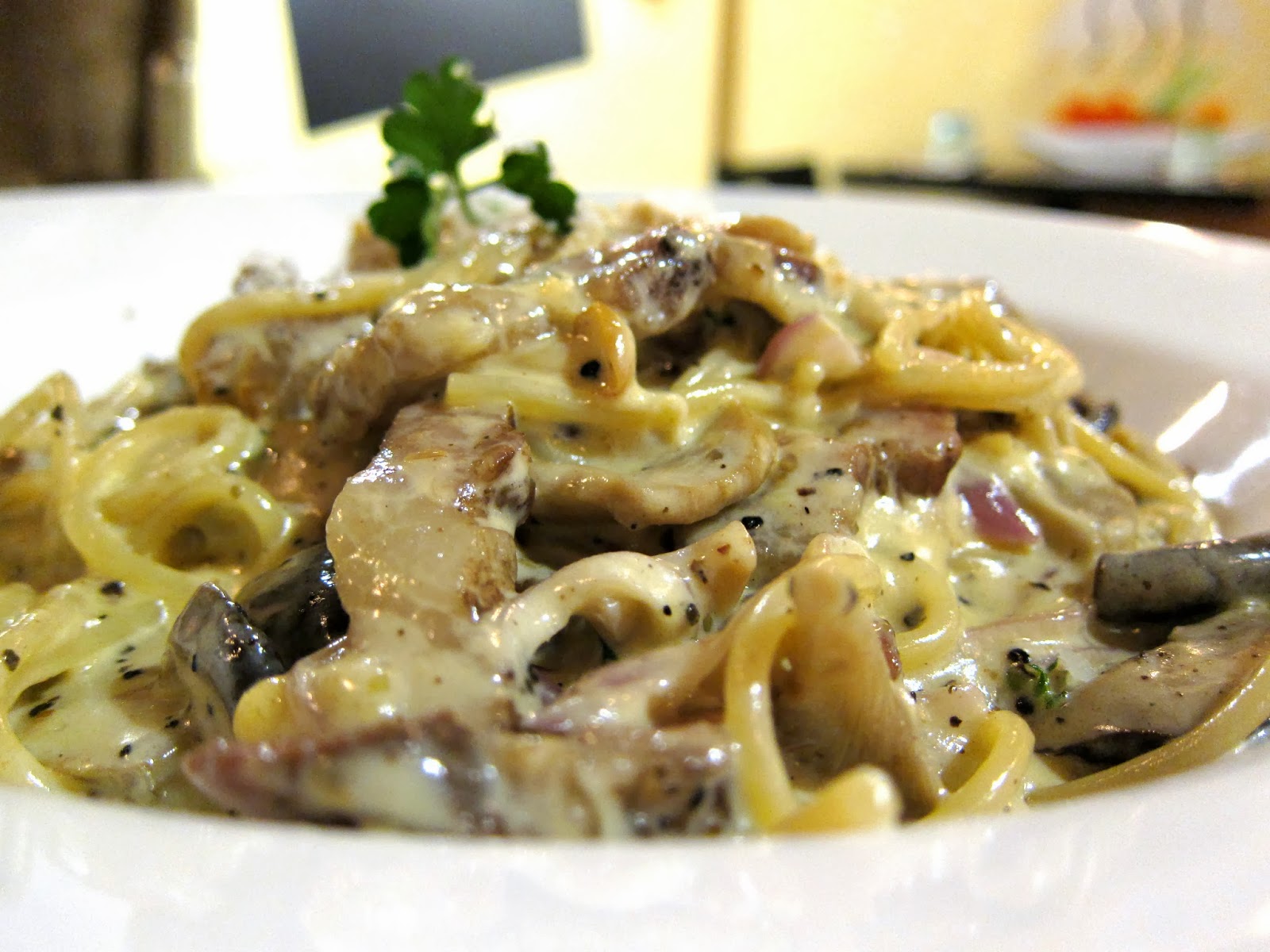 除了多到爆炸的鹹豬肉之外,還有菇類在裡面~配上吸附奶油蛋黃醬汁的義大利麵