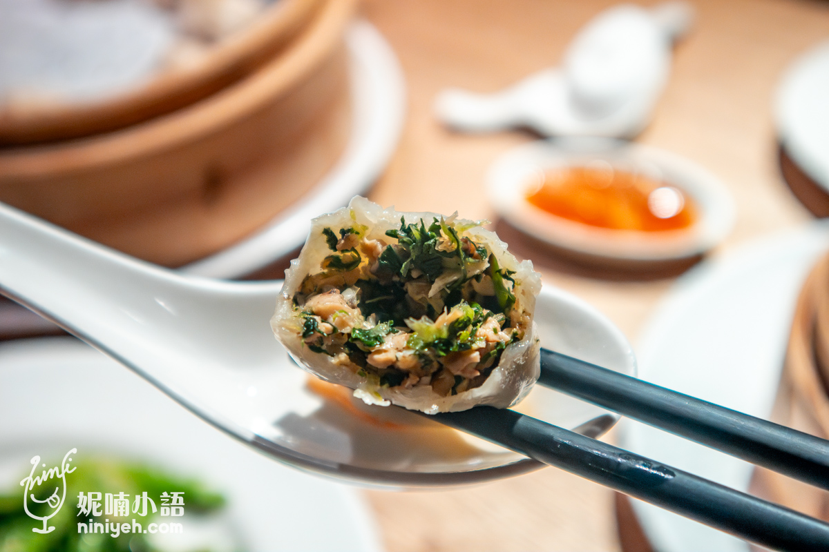 花素蒸餃一直是我的心頭好,來到『杭州小籠湯包民生店』也不免俗的點上一籠,手工精緻包折,尾翼如鳳尾般上揚確實很精巧,餡料飽滿扎實,裡面充填了剁碎的青江菜、豆干、豆皮,只是總覺得調味少了些甚麼,嚼來偏乾且生土味重了些,要沾些醋水才能掩蓋或者潤濕讓口感更好,如果沒有一定要試試看,其他蒸籠會是更好的選擇。