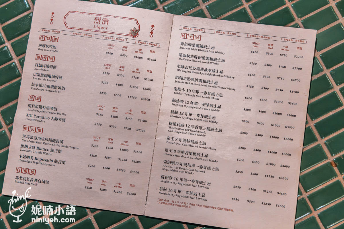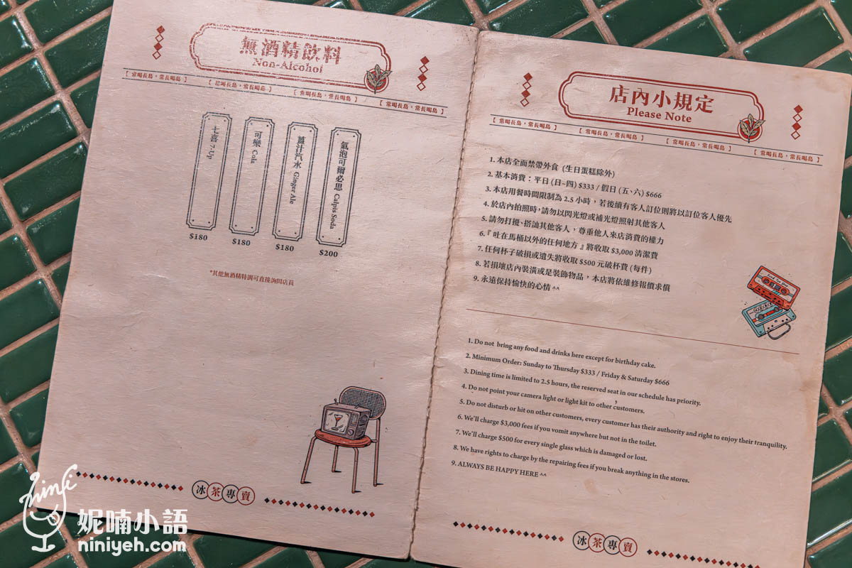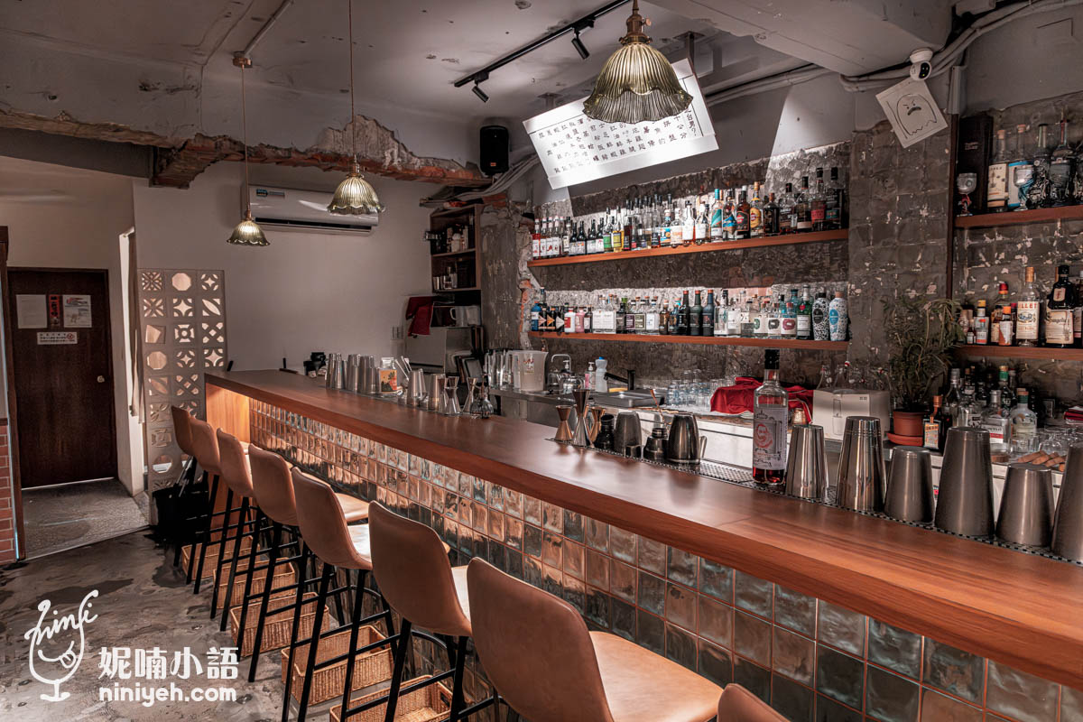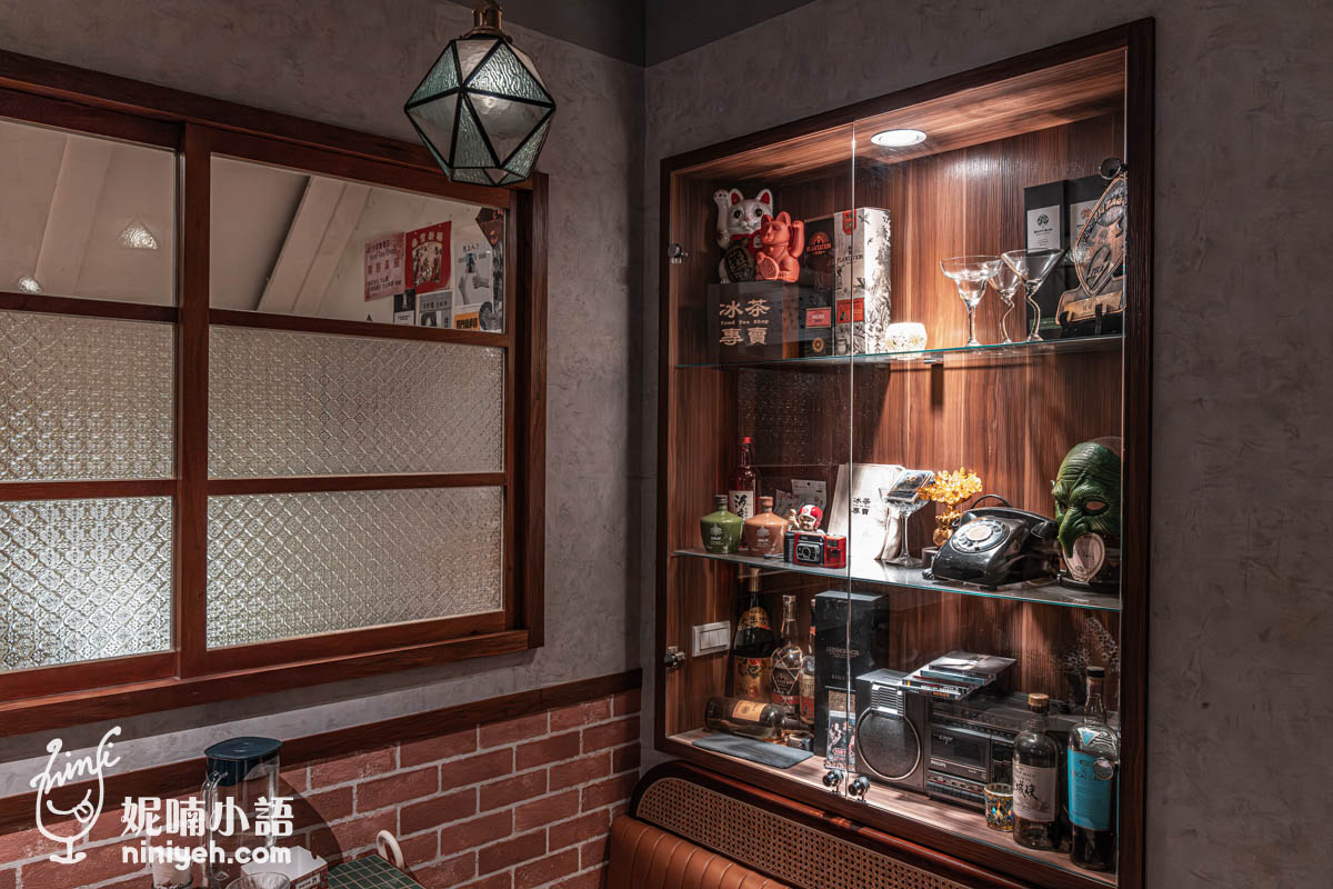 窗外是都市夜晚的喧囂,但窗內卻像是時間靜止的小世界,幾張深棕皮椅、綠格子磁磚桌、手工花藝與木製家具,台式設計元素都到齊了,熟悉又溫暖的聚會場域,接下來就是酒精的釋放了。
