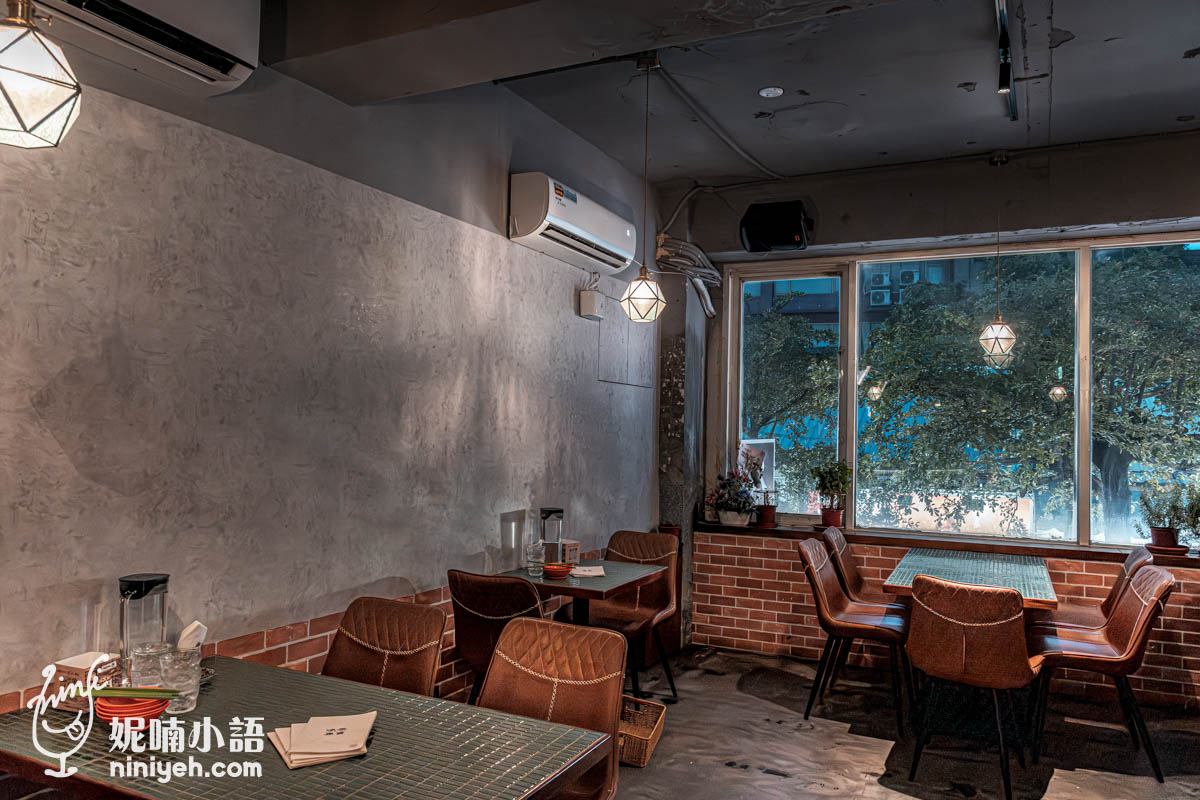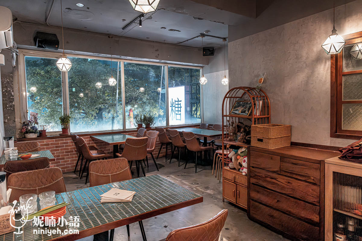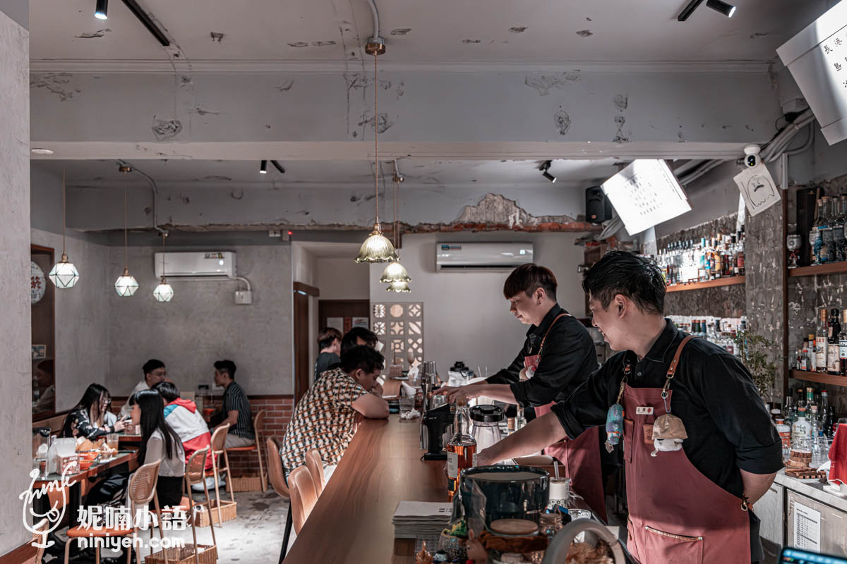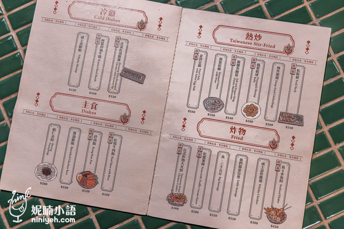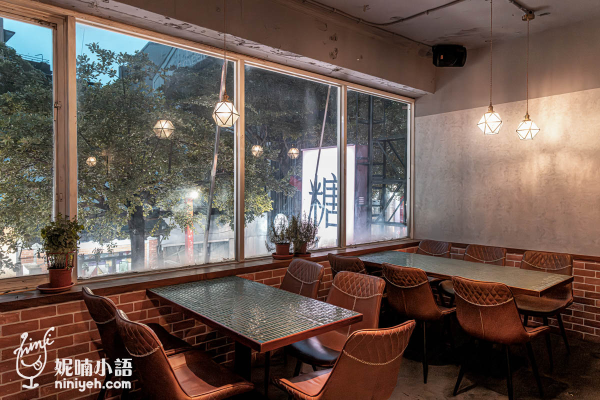 窗外是都市夜晚的喧囂,但窗內卻像是時間靜止的小世界,幾張深棕皮椅、綠格子磁磚桌、手工花藝與木製家具,台式設計元素都到齊了,熟悉又溫暖的聚會場域,接下來就是酒精的釋放了。