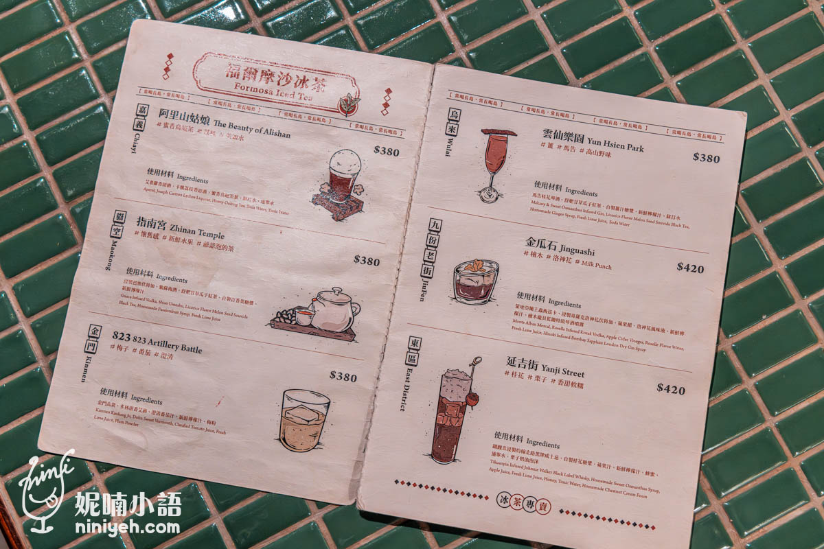 餐廳內主要以創意調酒為主,餐為輔。「福爾摩沙冰茶」顧名思義就是以台灣為創意的調酒,每一個名字都不陌生,而調酒不僅並非為命名而命名,內容也呼應在地意象,例如指南宮有名的就是貓空茶葉。