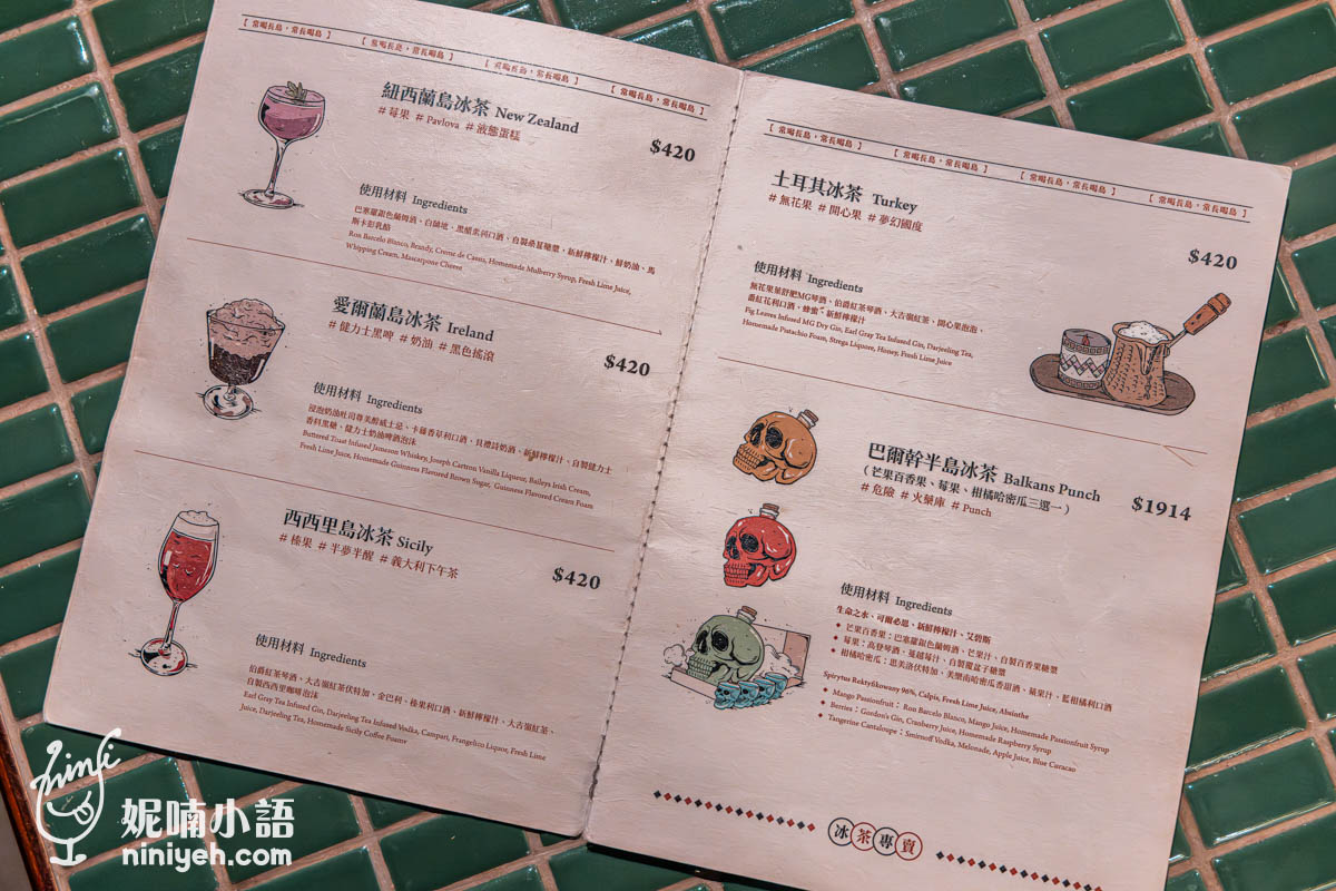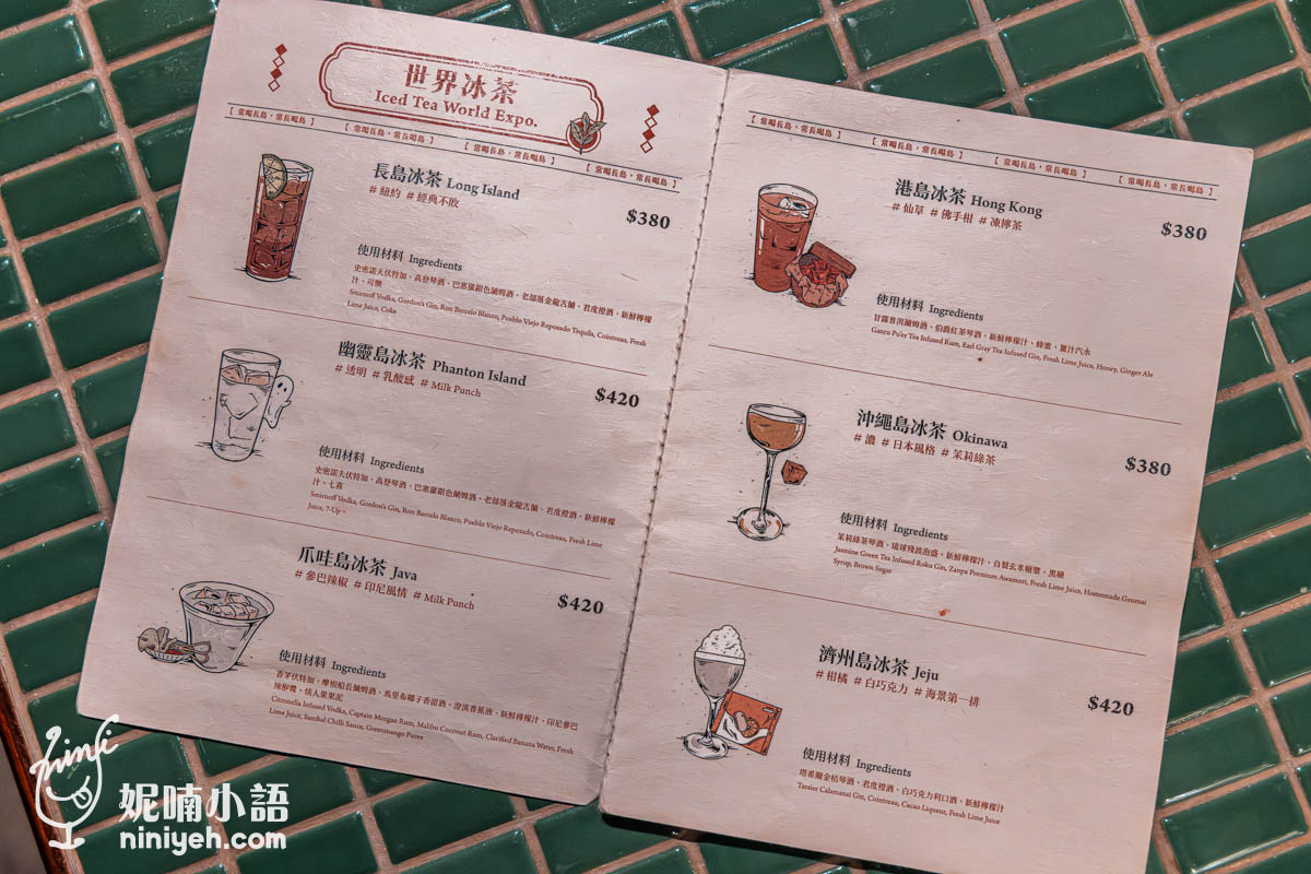 世界冰茶以「地域風格」命名並進行靈感調製,味道設計上結合當地文化印象,例如紐西蘭冰茶以 Pavlova為靈感,土耳其冰茶使用土耳其紅茶、無花果,並以茶系為主調融合各式烈酒,因為是多重酒體疊加,所以風味複雜,強調果味香甜,使用了例如如荔枝、鳳梨、葡萄柚、梅子、檸檬…,有些還加了Milk Punch,讓酒感被酸甜蓋住,可以說是越喝越危險。