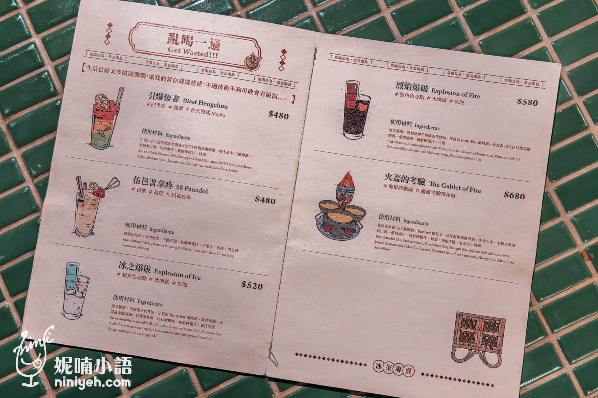 〈引爆恆春〉這款酒混合了96%生命之水(Spiritus)、OFTD黑蘭姆(Plantation O.F.T.D.)、野格(Jägermeister)、白蘭姆(Takamaka Rum Blanc)四款強烈基酒,如果拆開來每一種都能自己扛起主場,一旦混在一杯裡就是火力全開的「核爆級調酒」,我喝了以後就開始感覺有點不對勁,話變多了,思緒變快了,我想對於想要解放工作壓力的人,來一杯引爆恆春可以讓腦袋暫時離開世俗的繁瑣。