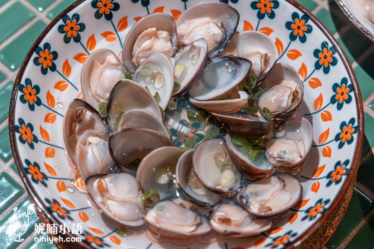 這道〈酒蒸蛤蜊〉是墊胃卻不占胃的佐酒之選,酒香迷人,蛤蠣飽滿鮮甜,幾許蔥花薑絲提味去腥,吃起來清爽無負擔,是一道能迅速喚醒味蕾的開胃菜。