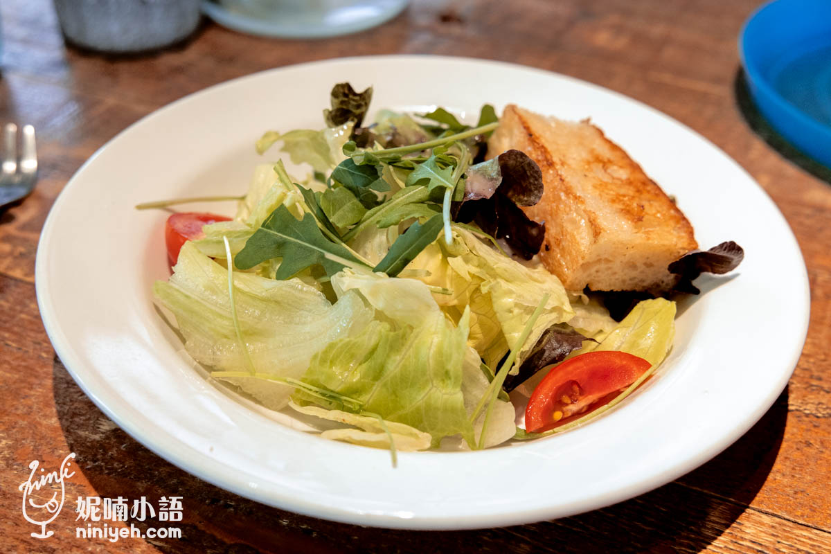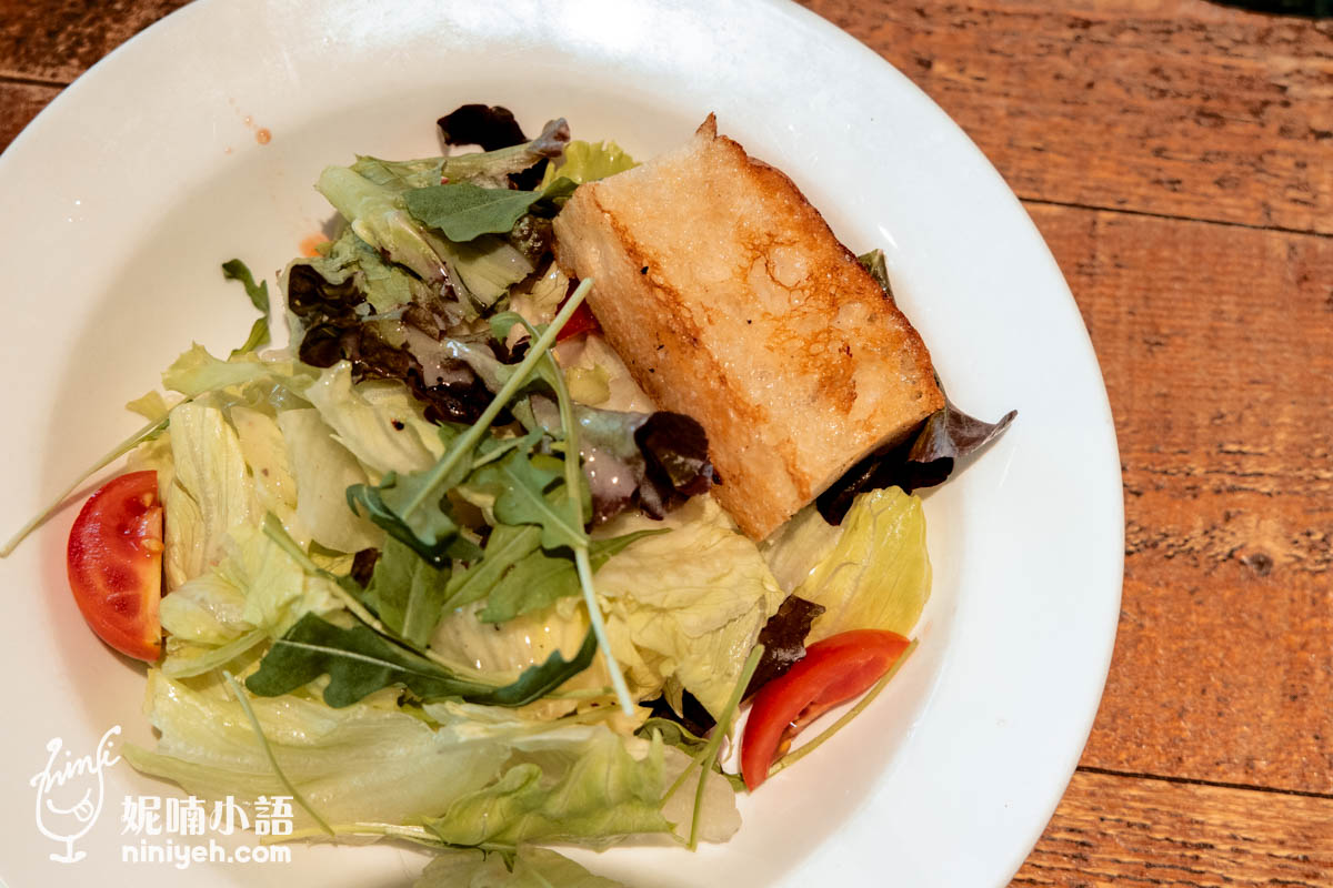 照片無法對照,這盤花園沙拉同樣也是多數餐廳附餐的一倍多,可以兩人分食了,而且還用了微苦的芝麻葉妝點,搭配一片佛卡夏麵包,有誠意啦!