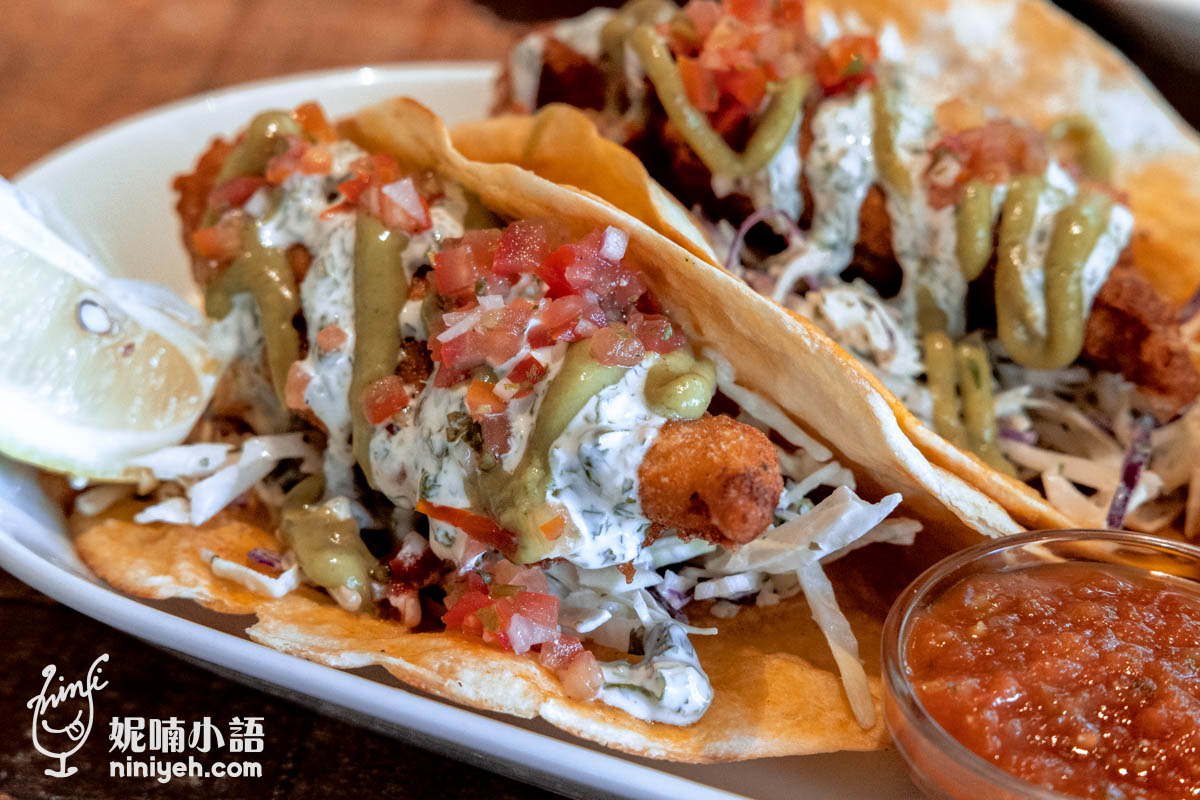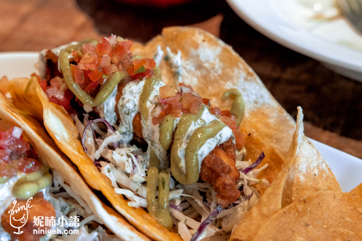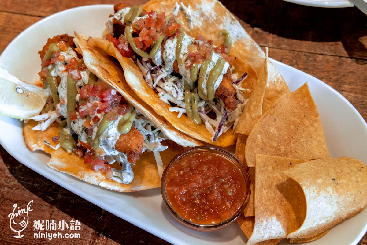 當初在點塔可時我有點擔心份量問題,因為墨西哥塔可有些是小小一片約莫手心大小,比較像點心非主餐,服務人員說的有點保守,因為端上桌的餐點份量把我嚇傻了,〈炸魚塔可〉一盤有兩份,搭配玉米片和莎莎醬,很澎派。