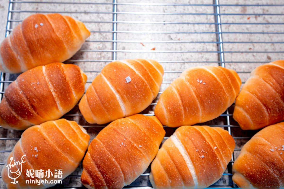 以購買門檻來說〈布袋鹽花奶油捲〉是最親民的,基於這個”優點”買來吃吃看,買尬!鹽花奶油捲不只賣相長得挺立標誌,也很有內在,麵包本體相當耐嚼,扎實中有柔軟,一圈圈捲起的層次中間夾著奶油,細膩地從口中慢慢融化,還有鹹香淡淡隱味一閃而過,如此化繁為簡需要真功夫阿。