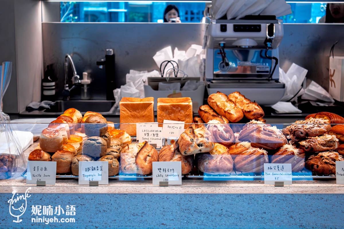 放眼望去『KANG Artisan Bakery』麵包櫃內品項不多,可頌、丹麥捲等酥皮類是招牌,還有司康、奶油捲、法棍、湯種土司算算約莫十種,定位很明確,不走大眾化的精品麵包,主打口味獨特的可頌和丹麥捲,適合挑嘴,不吃多吃精巧的客人,價格自然就高了。