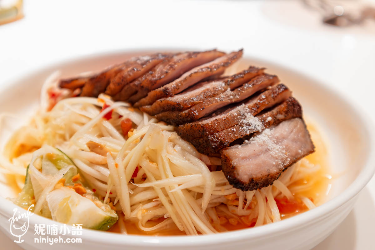 青木瓜沙拉就好比韓式餐廳桌上必配的涼拌小菜,是我每次到泰式餐廳最常點的開胃菜,這盤〈烤松阪豬青木瓜沙拉〉不以勁酸嗆辣的猛烈刺激來表現,而是以簡易版的清爽路線,不太吃辣的人也可以輕鬆品嘗,青木瓜刨絲厚度偏細,底料有蝦米、花生配上聖女番茄,酸甜中隱約透出微微辛辣,調味宜人,還有烤松阪豬的韌性也很加分,適合盛夏吃的一款開胃沙拉。