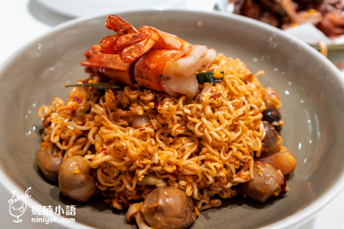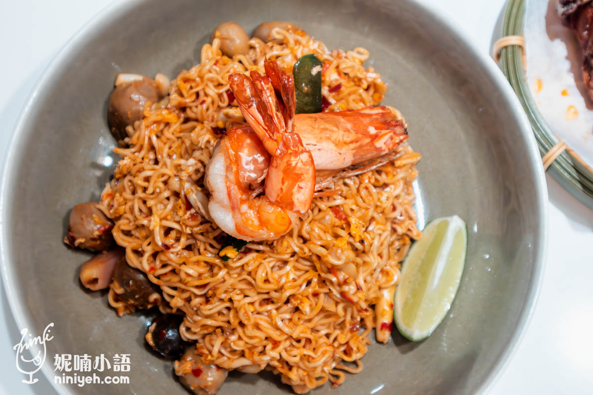 這道〈泰式鮮蝦炒泡麵〉盛盤乾淨俐落,但一吃好像喝到整碗濃縮的酸辣蝦湯,原來是加了香茅、南薑等辛香調料拌炒蛋花以及整顆草菇,最厲害的地方是炒泡麵保有麵條本身彈性,好似吸收了冬蔭貢鹹辣鮮的精華,簌簌地吃來好涮嘴,還有這尾大白蝦,開背去腸泥再油炸,肉質彈牙不說,現場吃就知道這尾蝦的分量多有誠意了!!