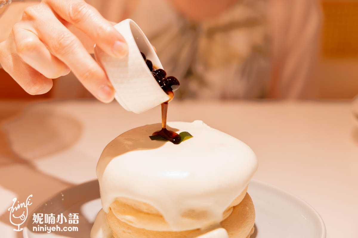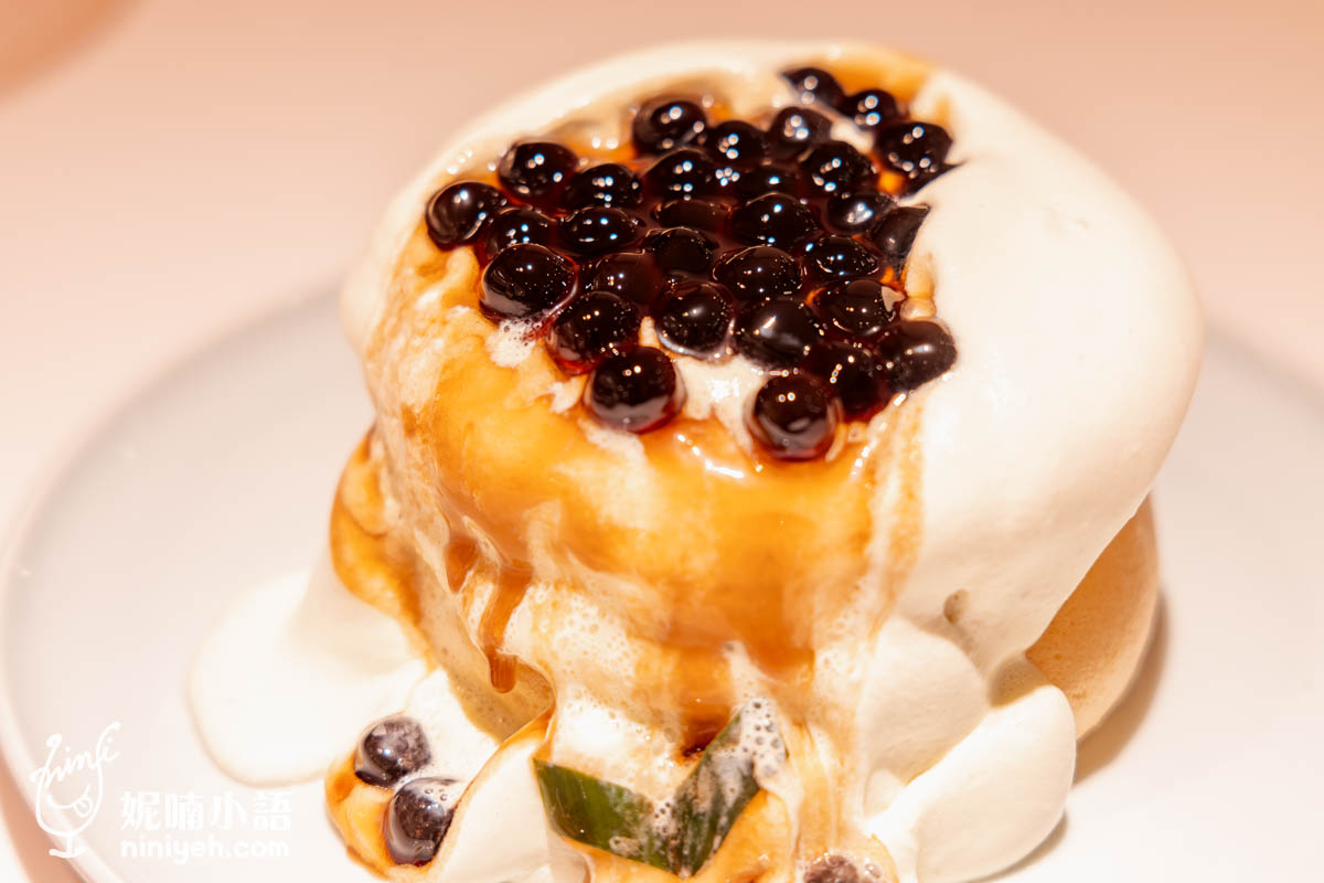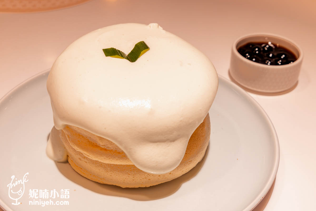 〈泰斑斕〉用斑斕葉做成很經典的泰式風味,手工攪打的斑斕葉慕斯細緻如奶油般滑順,隱約透出天然植物的芋香芬芳,趁熱淋上黑糖珍珠,彷似打在蓬鬆柔軟的雲朵裡,送入嘴裡還是暖熱熱的,舒芙蕾濃醇的雞蛋香溫柔撫慰,充滿輕盈空氣感又交錯珍珠軟實的彈性,那種若有似無的嚼感真是太棒了!!