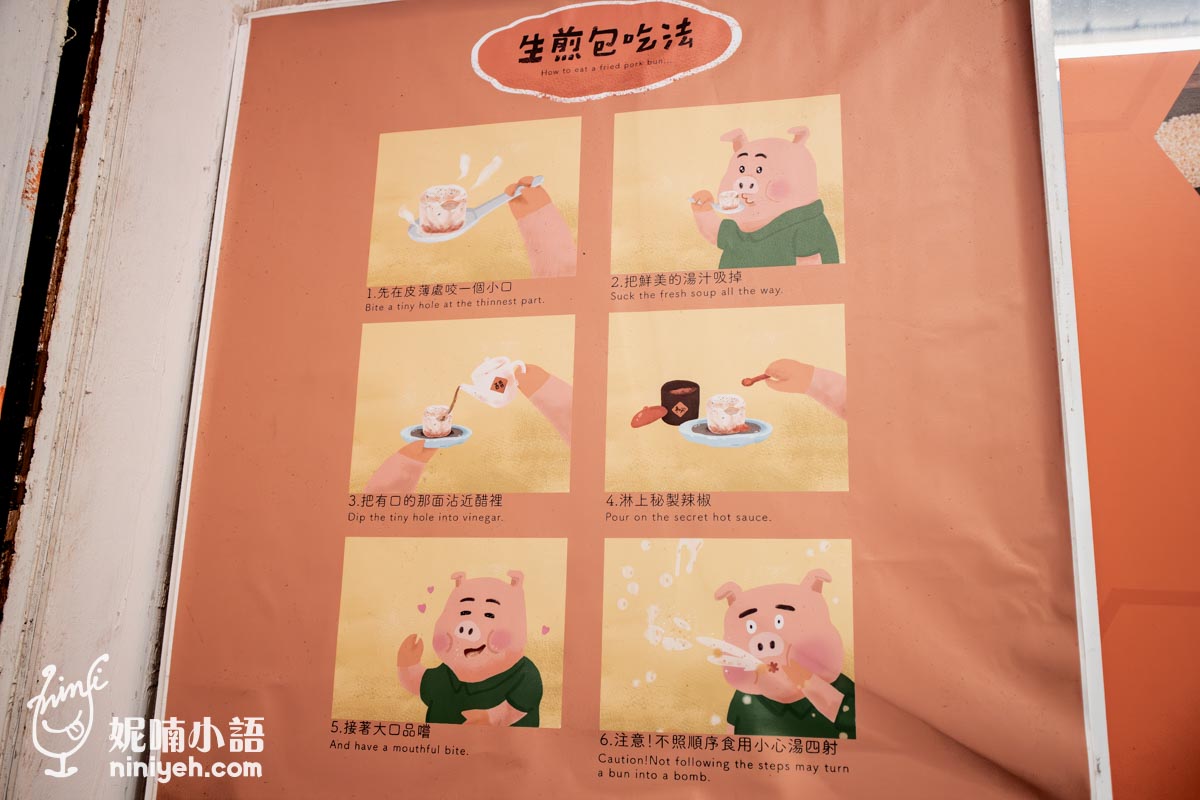 現場貼了圖說上海生煎包的吃法,就像吃湯包一樣咬個洞、添加醋和辣椒,最後塞進嘴裡。