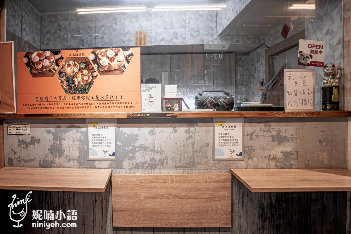 『爆汁老上海生煎中山總店』有整片櫥窗可以看到生煎包製作過程,另一邊窗口則是點餐取餐檯,因為在騎樓底下僅設幾張活動式木板桌,屬於立吞方式為主,所以大多客人採外帶。
