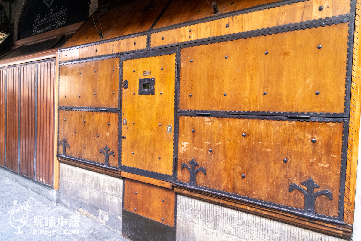 雖然『老橋(Ponte Vecchio)』全長不過百公尺,但走在上面你並不覺的是一座橋面,想是一條有坡度的商店街,兩側的金飾店舖還完整保留中古時期的樣貌,真的就像是電影情節裡的場景,不論是外圍的石牆,還是木造的拉門層板,甚至上面的鑄鐵印記還保留著麥第奇家族家徽圖騰,走著走著我腦海裡又想起了電影香水,想起了影集麥第奇家族,所到之處都是文藝復興所遺留下的美,佛羅倫斯真是太有韻味了。
