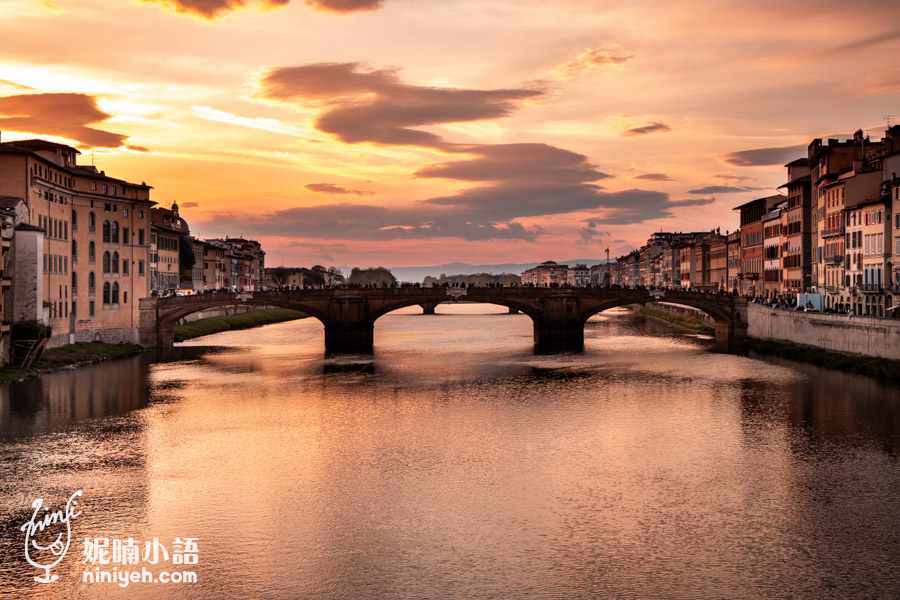 『佛羅倫斯老橋(Ponte Vecchio)』橫跨在阿諾河上,相鄰的還有天主聖三橋與恩寵橋,許多遊客會在黃昏時站在隔壁橋墩上往老橋(Ponte Vecchio)方向看過去,欣賞日落美景,很有味道!從烏菲茲美術館步行兩分鐘就能到老橋(Ponte Vecchio),穿越橋墩後向左走可以往米開朗基羅廣場,向右則是接連彼提宮、波波里花園,如果準備前往米開朗基羅廣場看夜景,黃昏時分就能先來『老橋(Ponte Vecchio)』。