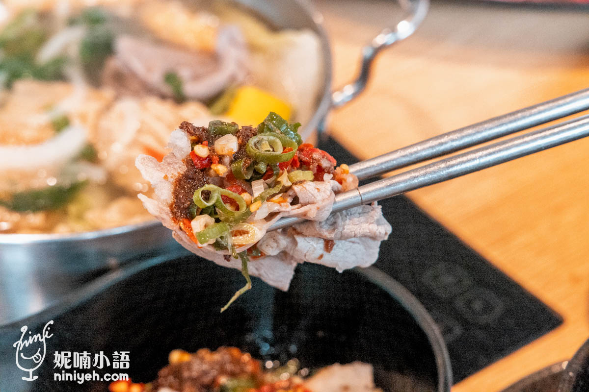 屬精實嚼感的梅花豬雖然不比牛肉甜美,但涮鍋浸潤湯頭後裹滿沾醬,再包夾滿滿蔥花蒜料,整口塞進嘴裡,那又辣又燙卻猛嚼的滋味真的很讚!