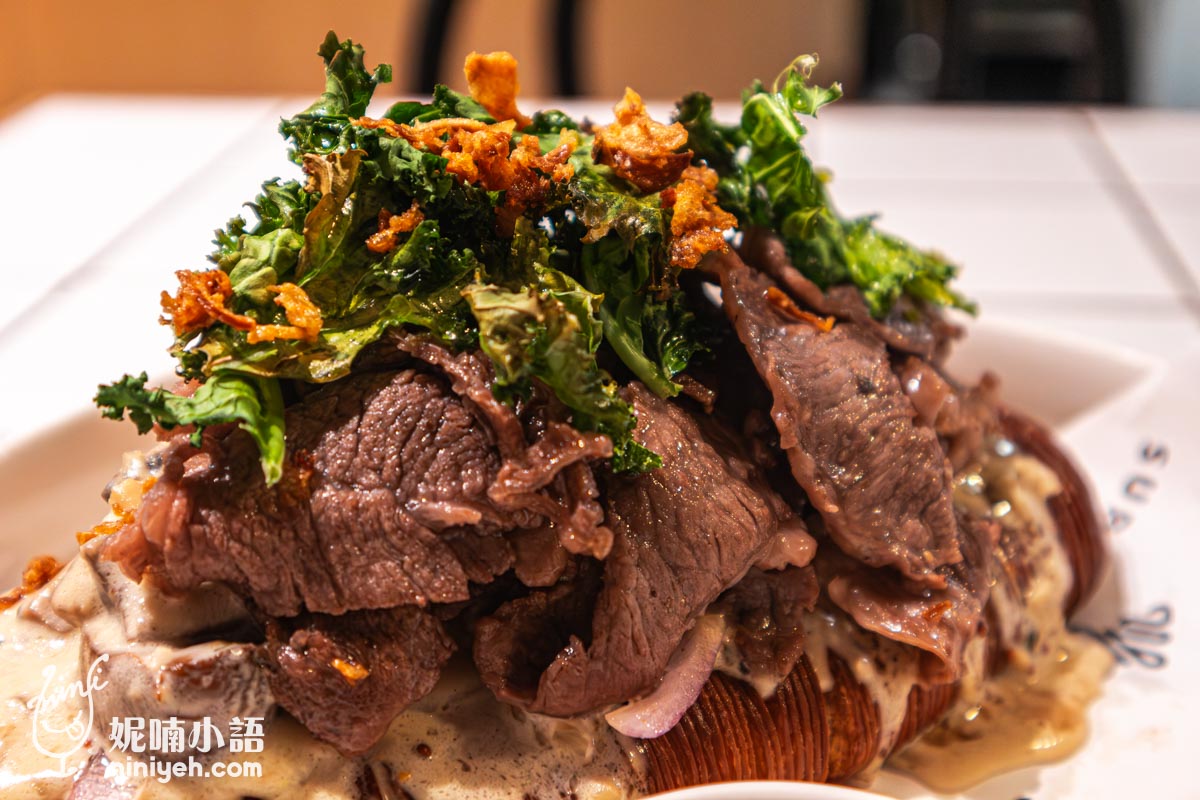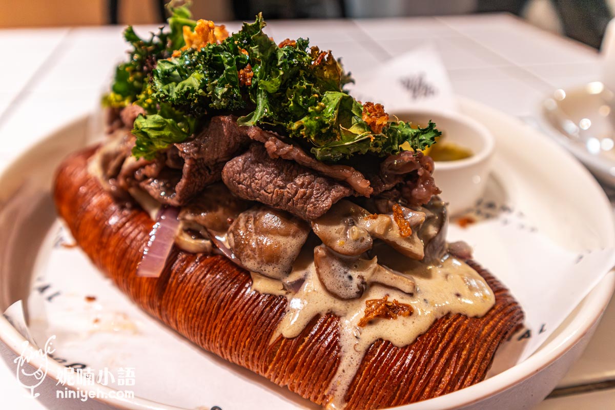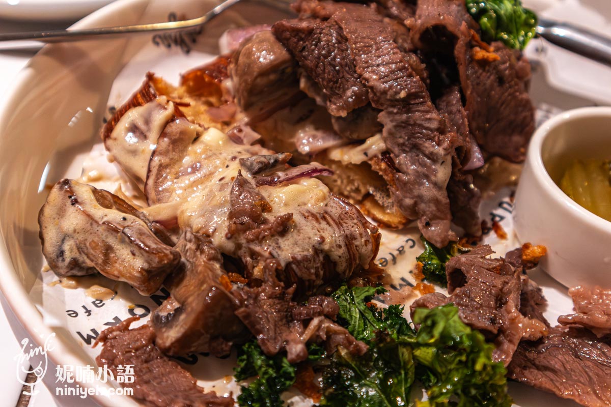 精華當然是生熟度拿捏精準的和牛肉片,完全挑不出筋膜,比牛小排還要嫩不說,還有濃郁的牛油醇香,早餐吃和牛真是好奢侈的享受,加持的重點還有特製的黛安牛排醬,帶點酸韻解膩,融合了炒蘑菇的濃厚,十分有層次,而且蘑菇刻意大塊切營造的啾啾口感也讓我印象深刻。