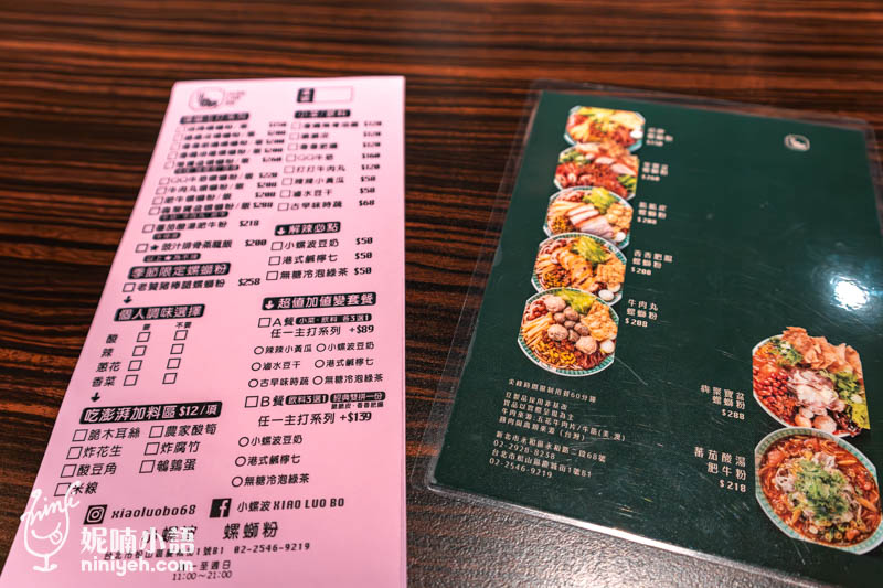 小螺波點餐採以半自助方式,桌面上都備有簡單的圖片參考,可以照喜好自行填寫劃單,有近十種口味和不同組合的螺螄粉,簡單來說分成港式油雞、脆腸、脆皮燒肉的豬肉口味螺螄粉,以及牛筋、肥牛、牛肉丸組成的牛肉口味螺螄粉,同口味也有泛可以選擇,搭配幾項單點小菜、飲料,一點都不複雜